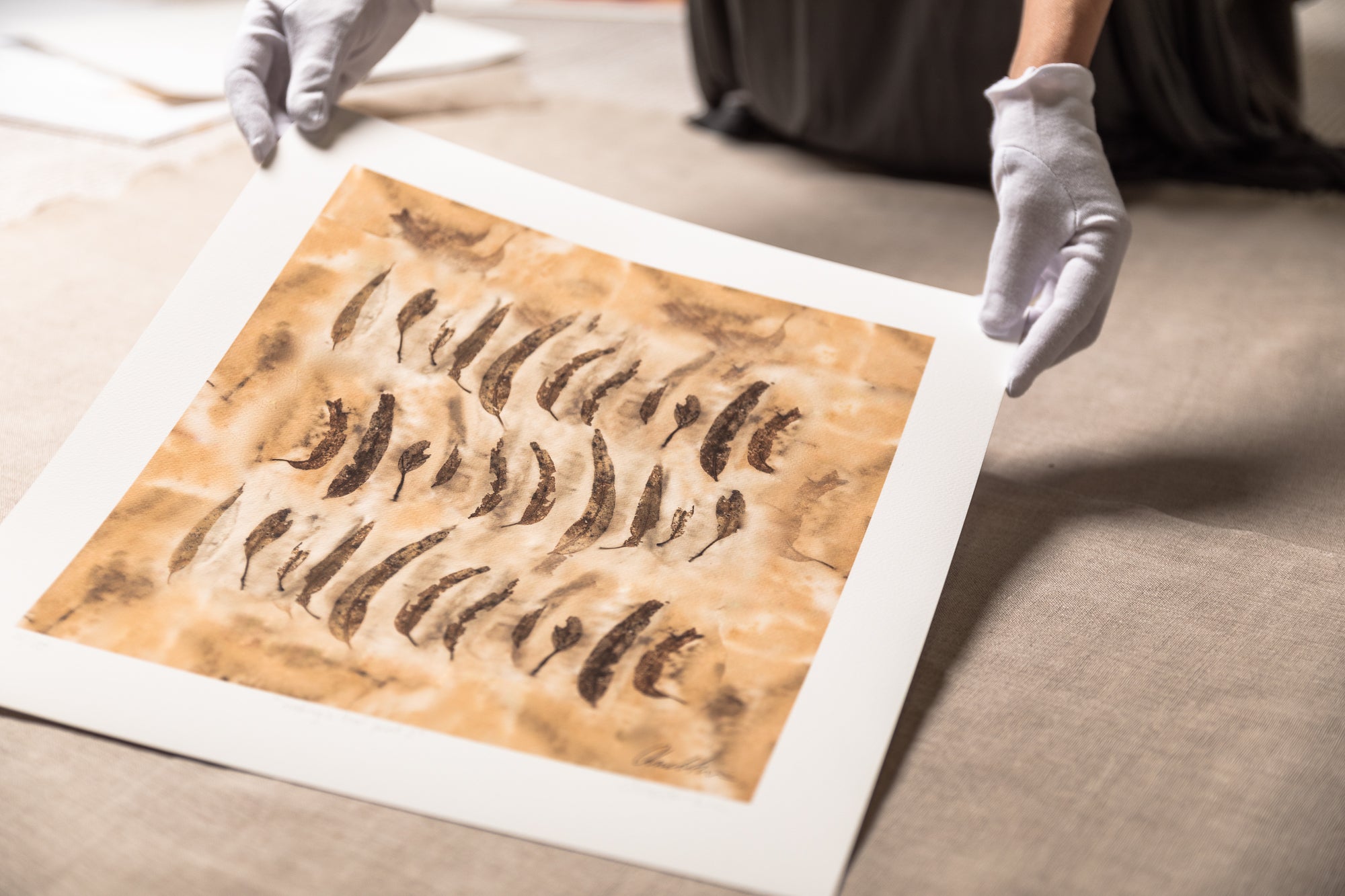 Working with a 1000 year old Eucalyptus Tree that had fallen led me on a five year journey of learning and connection. Some of the leaves were used to create this series of work, that follows the lifecycle of Endings, Walking side by side, New Beginnings and Renewal. A lot of the wood went back into the community as sculpted native bee hives that honour the history, culture and stories embedded in the people, the country, and in its plants. Learn more of the story at Tree Place.